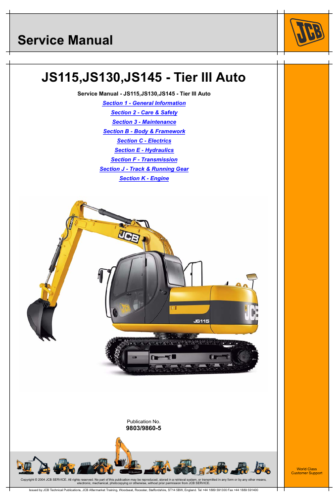 With this original factory Service manual, the technician can detect and solve any problems encountered when repairing your JCB JS130 Excavator and This workshop repair manual for the JCB JS130 Excavator provides detailed instructions and technical information for maintenance and repair tasks to keep your equipment in top condition.