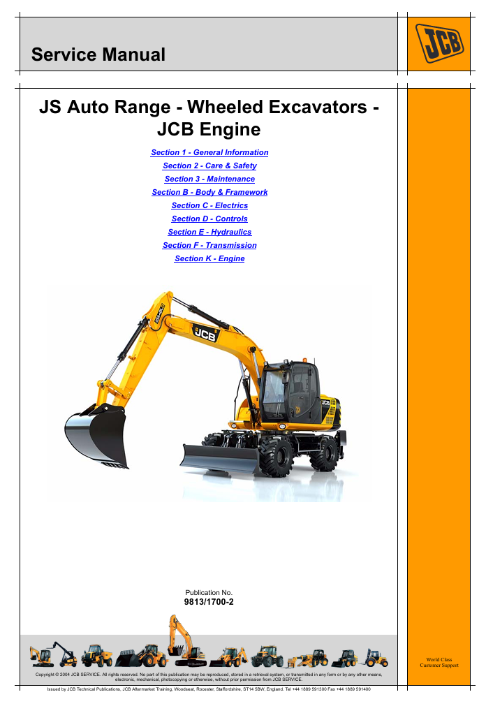 With this original factory Service manual, the technician can detect and solve any problems encountered when repairing your JCB JS145W Wheeled Excavator and This workshop repair manual for the JCB JS145W Wheeled Excavator provides detailed instructions and technical information for maintenance and repair tasks to keep your equipment in top condition.