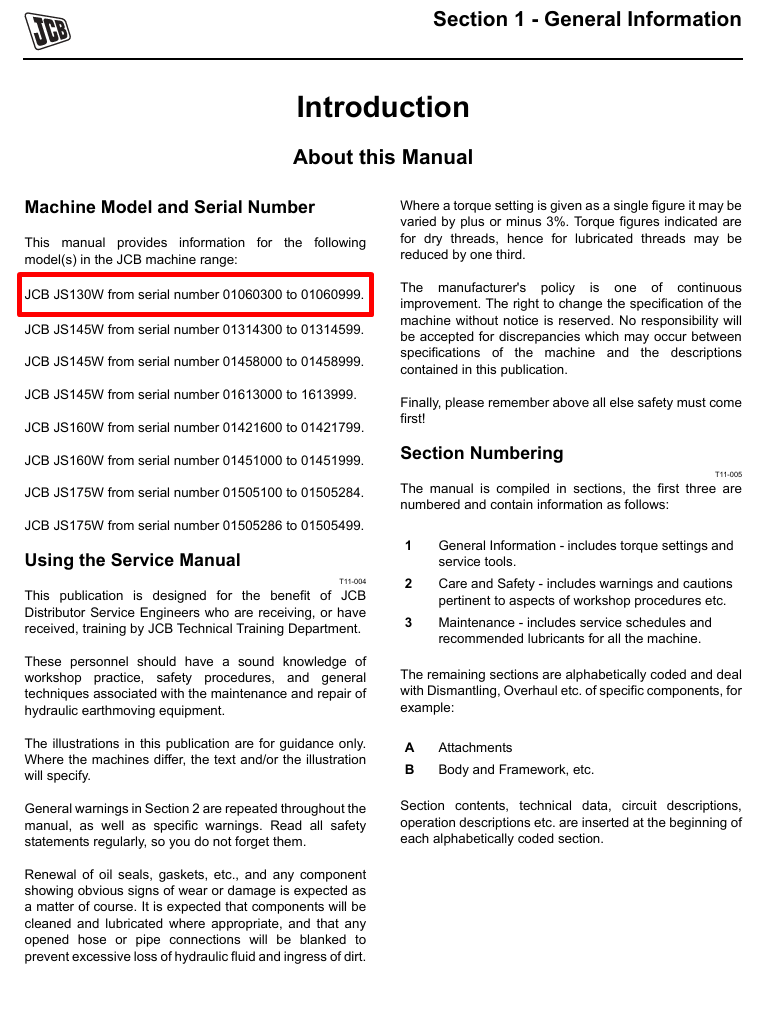With this original factory Service manual, the technician can detect and solve any problems encountered when repairing your JCB JS145W Excavator and This workshop repair manual for the JCB JS145W Excavator provides detailed instructions and technical information for maintenance and repair tasks to keep your equipment in top condition.