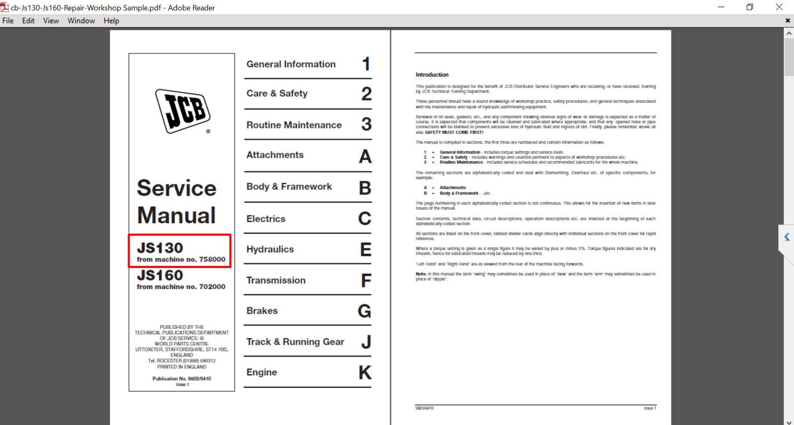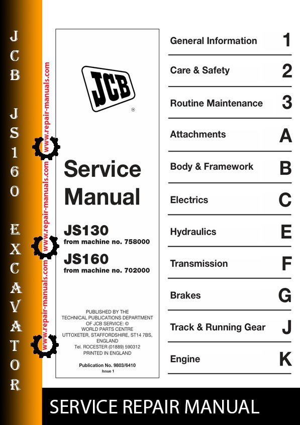 With this original factory workshop manual, the technician can detect and solve any problems encountered when repairing your jcb Excavator and This workshop repair manual for the JCB JS160 Excavator provides detailed instructions and technical information for maintenance and repair tasks to keep your equipment in top condition.