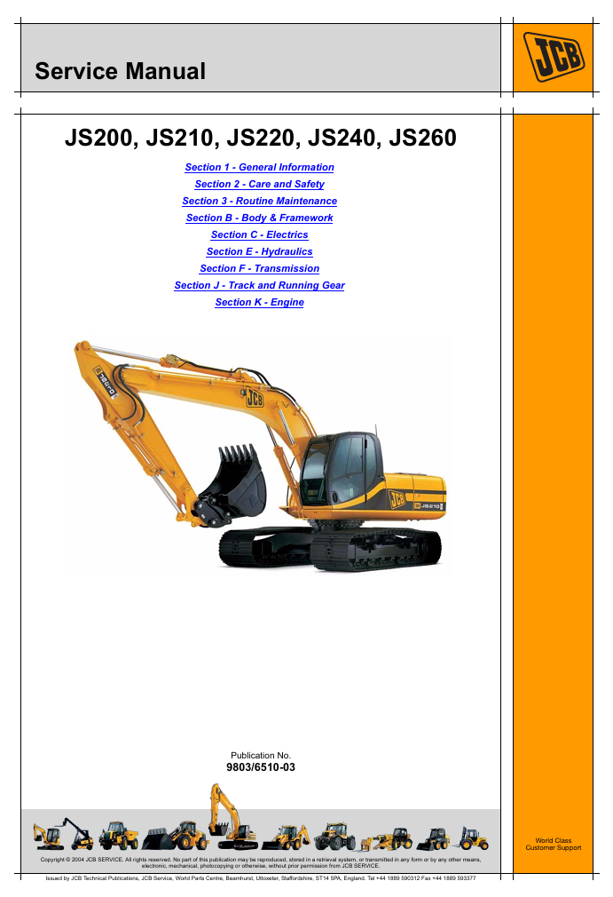With this original factory Service manual, the technician can detect and solve any problems encountered when repairing your JCB JS200 Excavator and This workshop repair manual for the JCB JS200 Excavator provides detailed instructions and technical information for maintenance and repair tasks to keep your equipment in top condition.