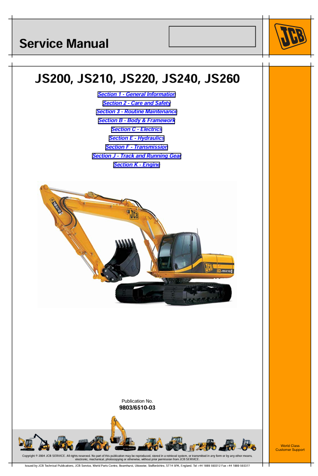 With this original factory workshop manual, the technician can detect and solve any problems encountered when repairing your jcb Excavator and This workshop repair manual for the JS200 Excavators, provides detailed instructions and technical information for maintenance and repair tasks to keep your equipment in top condition.