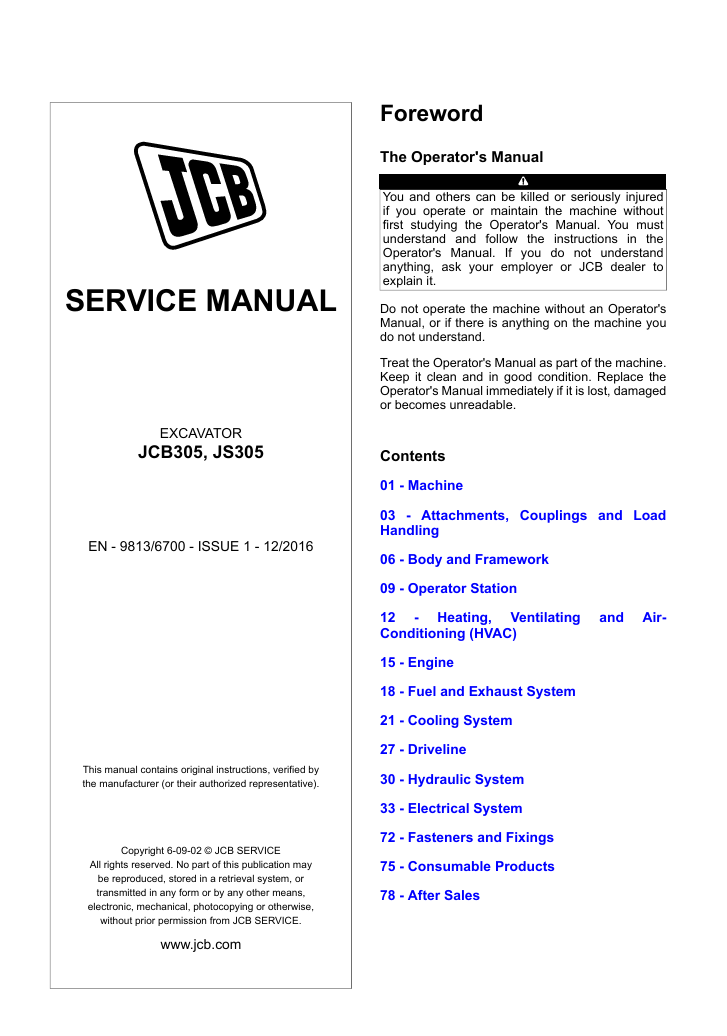 With this original factory Service manual, the technician can detect and solve any problems encountered when repairing your JCB JS305 Excavator and This workshop repair manual for the JCB JS305 Excavator provides detailed instructions and technical information for maintenance and repair tasks to keep your equipment in top condition.