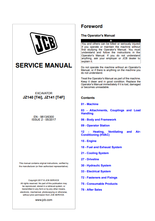 Enhance the longevity and performance of your JCB JZ140 T4i and JCB JZ141 excavators with our comprehensive Service Repair Manual. This essential guide provides detailed instructions, diagrams, and troubleshooting tips to ensure efficient maintenance and repairs. With step-by-step procedures tailored specifically for these models, you can confidently tackle any service task, minimizing downtime and maximizing productivity on the job site. Invest in this manual today to keep your equipment running smoothly and efficiently