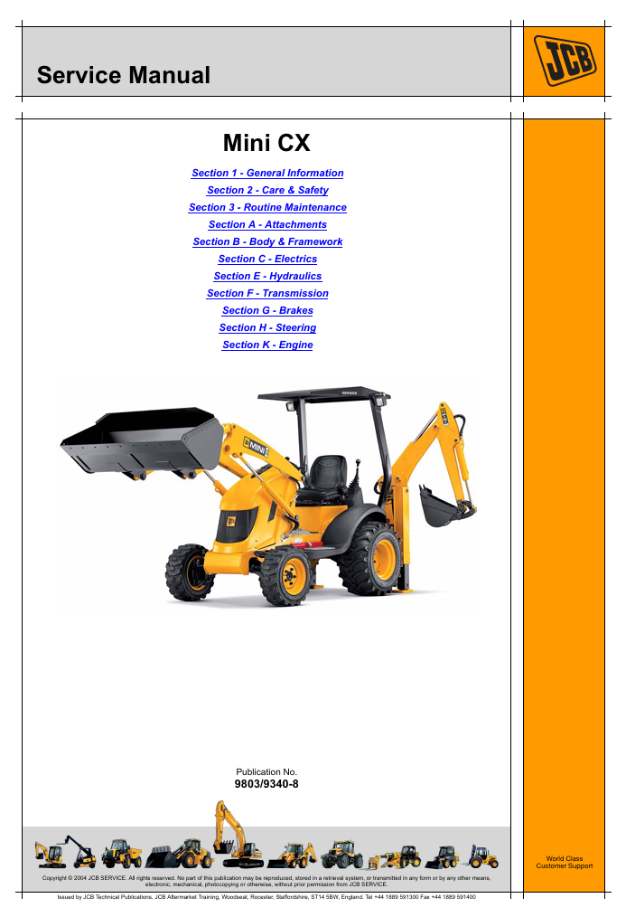 With this original factory Service manual, the technician can detect and solve any problems encountered when repairing your JCB Mini CX 4×4 Backhoe Loader and This workshop repair manual for the JCB Mini CX 4×4 Backhoe Loader provides detailed instructions and technical information for maintenance and repair tasks to keep your equipment in top condition.