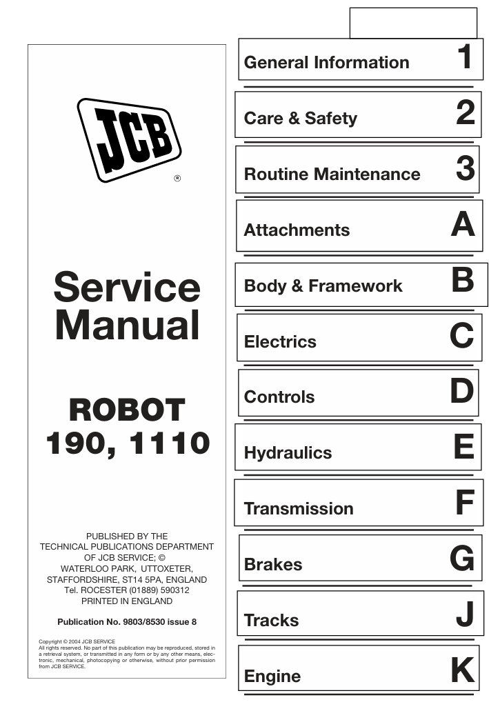 With this original factory Service manual, the technician can detect and solve any problems encountered when repairing your JCB Robot 1110 Skid Steer Loader and This workshop repair manual for the JCB Robot 1110 Skid Steer Loader provides detailed instructions and technical information for maintenance and repair tasks to keep your equipment in top condition.