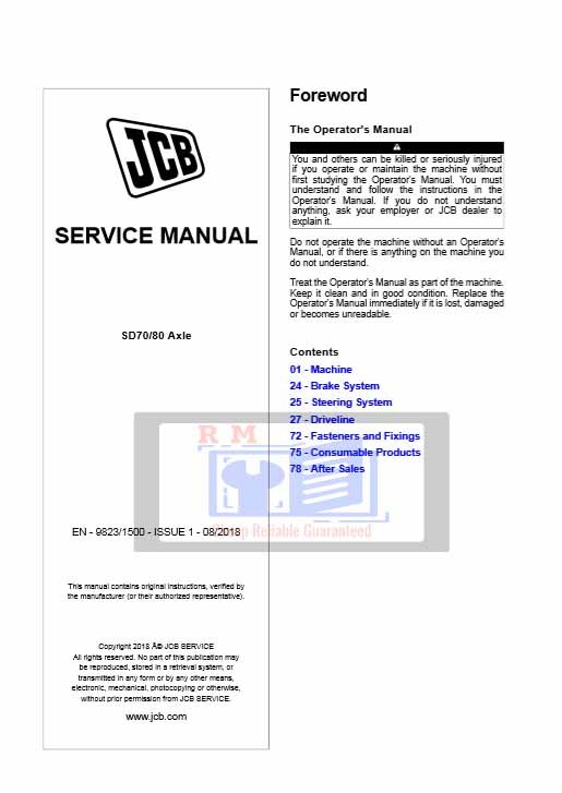 The JCB SD70 and SD80 Axle Service Repair Manual is the official OEM guide for maintaining, diagnosing, and repairing the axle systems used in a range of JCB equipment. This manual is an essential resource for service technicians, mechanics, and fleet operators responsible for ensuring optimal performance and durability of these heavy-duty axles.