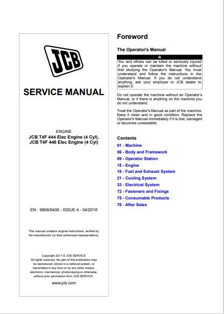 Whether you’re performing a quick service or a complete overhaul, this manual is your essential companion for maximizing the performance and longevity of your JCB T4F-444 Engine and JCB T4F-448 Engine