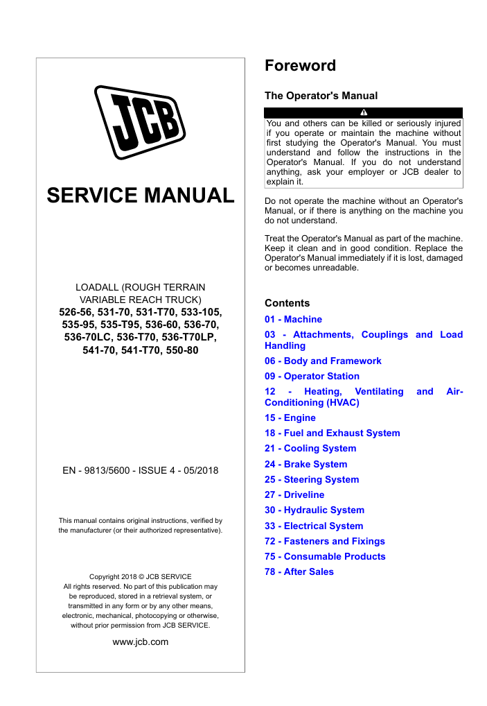 With this original factory Service manual, the technician can detect and solve any problems encountered when repairing your JCB 536-T70LP Telehandler and This workshop repair manual for the JCB 536-T70LP Telehandler provides detailed instructions and technical information for maintenance and repair tasks to keep your equipment in top condition.