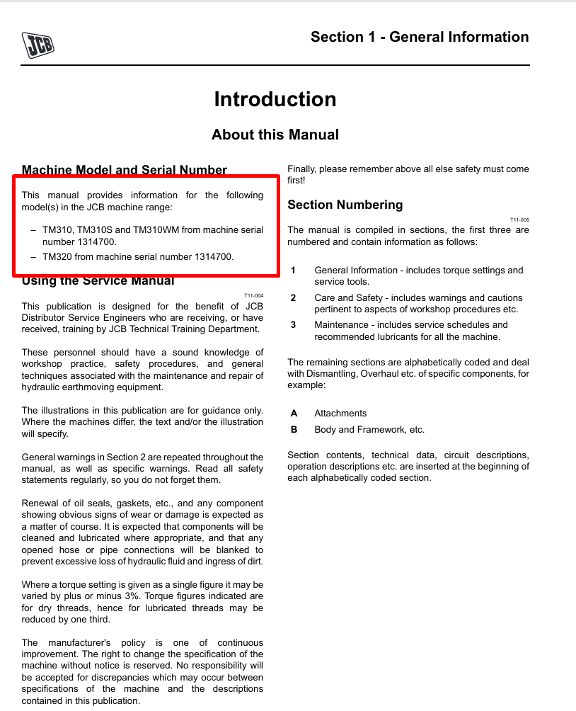 With this original factory Service manual, the technician can detect and solve any problems encountered when repairing your JCB TM310 Wheel Loader and This workshop repair manual for the JCB TM310 Wheel Loader provides detailed instructions and technical information for maintenance and repair tasks to keep your equipment in top condition.