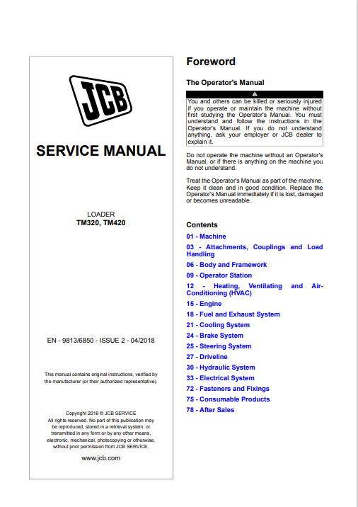 The JCB TM320 and TM420 Loader Service Repair Manual is an essential resource for maintaining the performance and longevity of your equipment. This comprehensive guide provides detailed instructions, diagrams, and troubleshooting tips, ensuring that you can efficiently service and repair your loader with confidence. With clear, step-by-step procedures, this manual empowers you to tackle any maintenance task, reducing downtime and enhancing productivity on the job site. Invest in this manual to keep your JCB loaders operating at peak efficiency