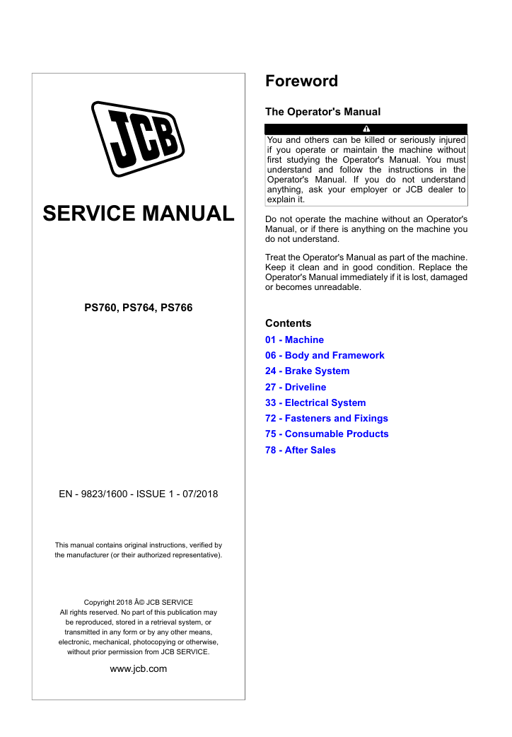 With this original factory Service manual, the technician can detect and solve any problems encountered when repairing your JCB Transmission PS760 and This workshop repair manual for the JCB Transmission PS760 provides detailed instructions and technical information for maintenance and repair tasks to keep your equipment in top condition.