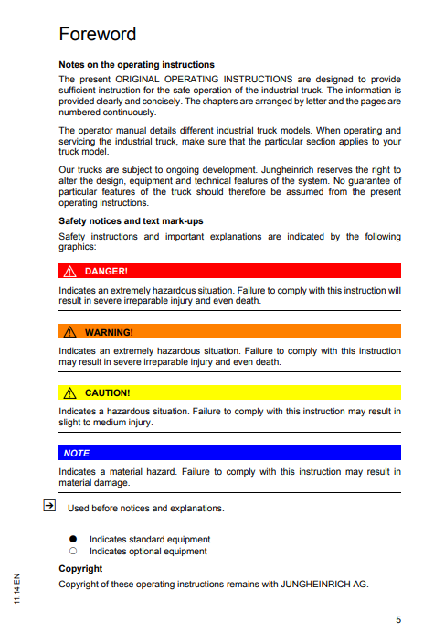 The Factory was highly recommended use this Operating Instructions Manual before you touch your Jungheinrich Forklift