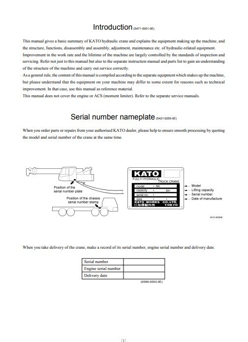It was strongly advised by the factory that operators and machine owners to use this handbook before operating or repairing their KATO Machines.