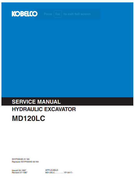 The Kobelco MD120LC Excavator Service Repair Manual is an essential resource for maintaining and repairing your excavator with precision and confidence. This comprehensive guide provides detailed instructions, diagrams, and troubleshooting tips, ensuring that you can efficiently address any issues that arise. With its user-friendly format, this manual empowers operators and technicians alike to enhance the performance and longevity of their equipment, making it a valuable addition to your maintenance toolkit. Invest in the Kobelco MD120LC Excavator Service Repair Manual today and keep your machinery running smoothly
