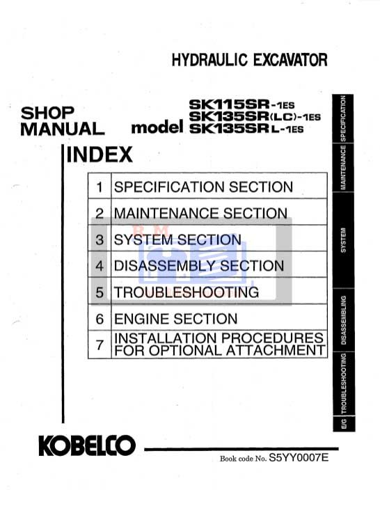 Whether you’re performing a quick service or a complete overhaul, this manual is your essential companion for maximizing the performance and longevity of your Kobelco SK115SR-1ES, Kobelco SK135SR LC-1ES, Kobelco SK135SR L-1ES Excavators