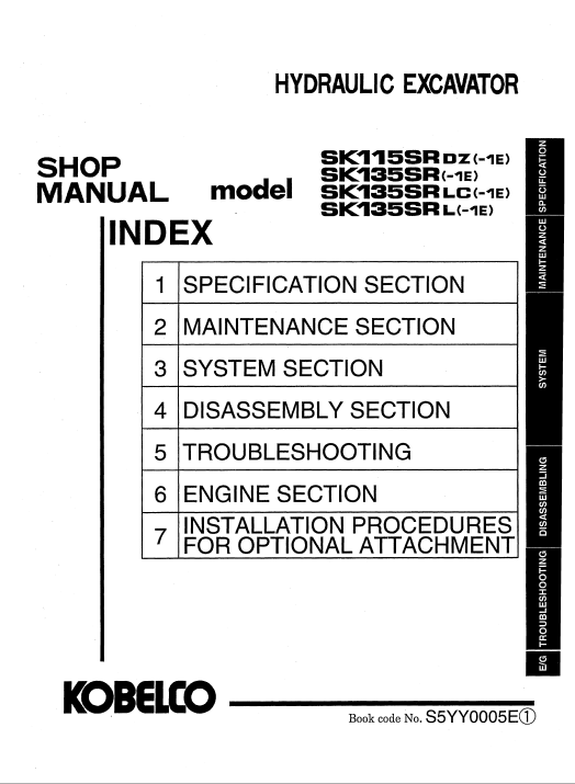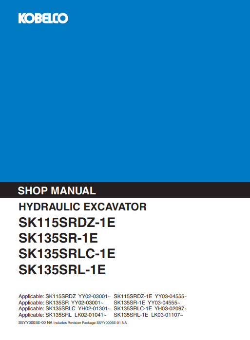 Repair manual covering Kobelco SK115SRDZ-1E and SK135SR series excavators for maintenance and troubleshootingKobelco SK115SRDZ-1E, Kobelco SK135SRLC-1E, Kobelco SK135SRLC-1E, Kobelco SK135SRL-1E Workshop Repair Manual