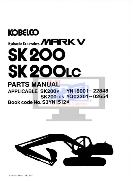 Parts manual for Kobelco SK200 Mark V and SK200LC Mark V excavators, detailing components and assembly instructionsKobelco SK200 Mark V,  SK200LC Mark V Excavator Parts Manual