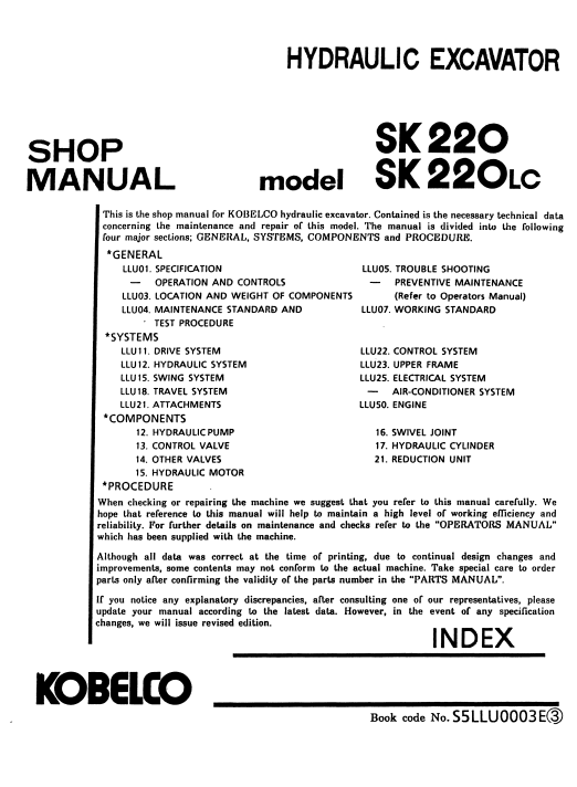 The Kobelco SK220 and SK220LC Excavator Workshop Repair Manual is an essential resource for any technician or DIY enthusiast looking to maintain and repair these powerful machines. This comprehensive manual provides detailed instructions, diagrams, and troubleshooting tips, ensuring you have all the information needed to keep your excavator running smoothly. With its user-friendly layout and clear illustrations, you can easily navigate through complex repairs and maintenance tasks, saving time and reducing downtime on the job. Invest in this manual to enhance your knowledge and ensure the longevity of your Kobelco excavator