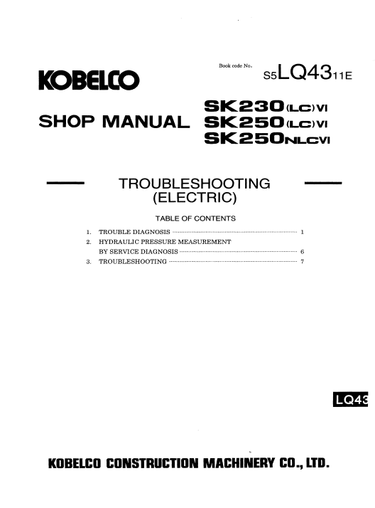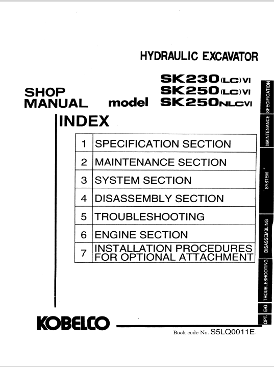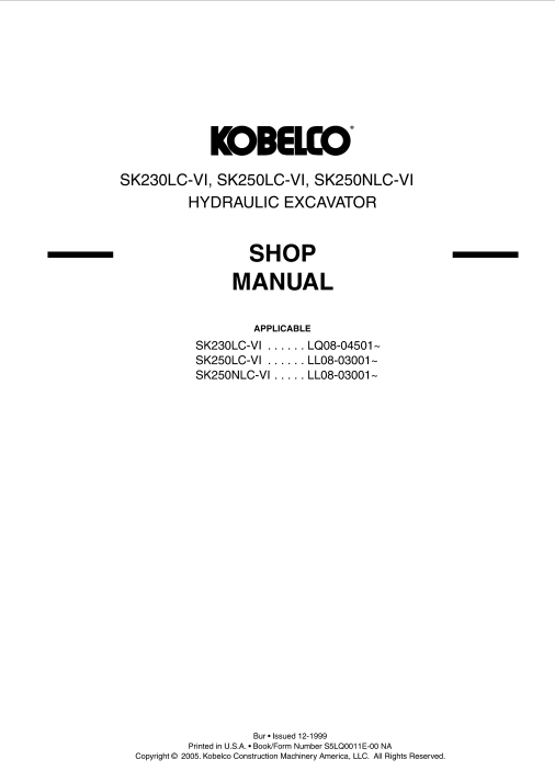 Enhance your maintenance capabilities with the Kobelco SK230LC-VI, SK250LC-VI, and SK250NLC-VI Workshop Repair Manual. This comprehensive guide is designed to provide you with detailed instructions, diagrams, and troubleshooting tips to ensure optimal performance and longevity of your Kobelco excavators. With easy-to-follow steps and expert insights, you can confidently tackle repairs and maintenance tasks, saving time and reducing downtime. Invest in this essential manual to keep your machinery running smoothly and efficiently