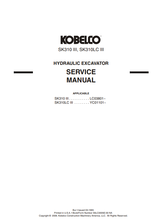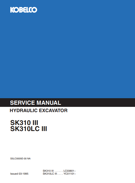 The Kobelco SK310 III and SK310LC III Service Repair Manual is an essential resource for maintaining the performance and longevity of your excavator. This comprehensive guide provides detailed instructions, diagrams, and troubleshooting tips, ensuring that you can efficiently address any service or repair needs. With this manual, you can save time and money by performing maintenance tasks yourself, while also enhancing the reliability of your equipment. Invest in this manual to keep your Kobelco excavator running smoothly and efficiently