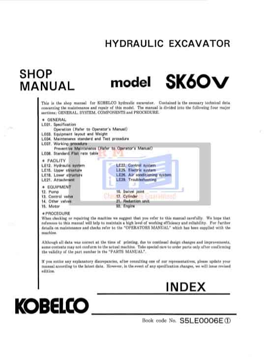 Whether you’re performing a quick service or a complete overhaul, this manual is your essential companion for maximizing the performance and longevity of your Kobelco SK60V (Mark5) Excavator