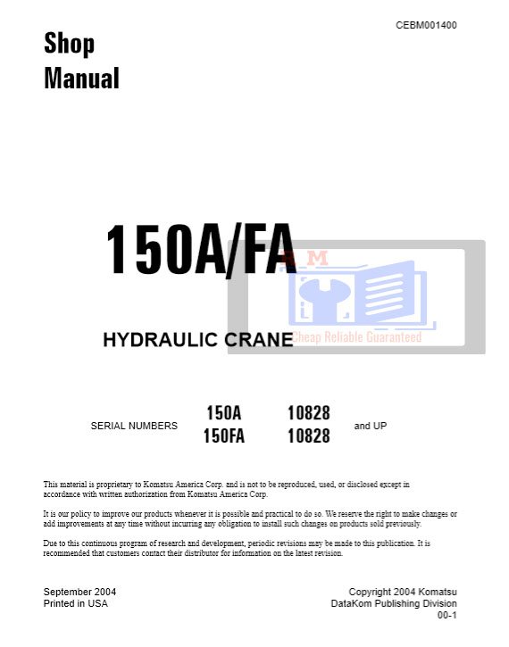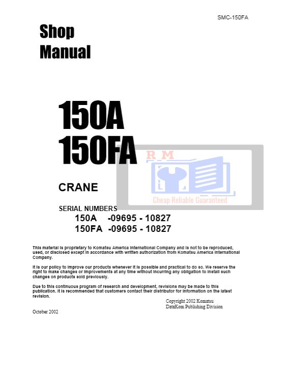 he Komatsu 150A and 150FA Crane Workshop Manual is the factory-issued technical guide for maintaining, servicing, and repairing these specialized Komatsu cranes. Ideal for technicians, service centers, and equipment owners, this manual provides in-depth procedures, diagrams, and specifications to ensure safe operation and long-term performance.