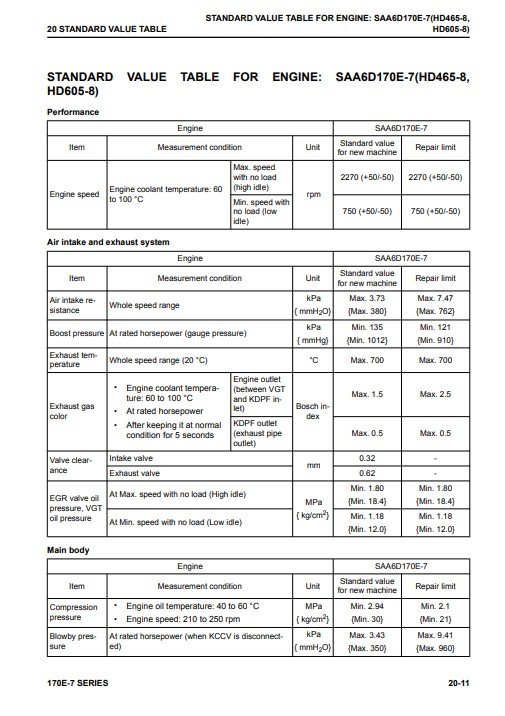 STANDARD VALUE TABLE FOR ENGINE: SAA6D170E-7 (HD465-8, HD605-8)