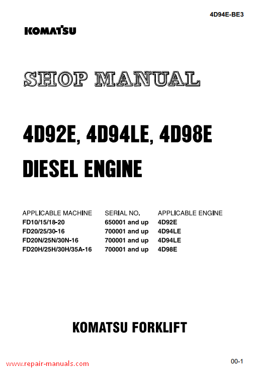 Comprehensive repair manual for Komatsu 4D92E, 4D94LE, and 4D98E diesel engines, including troubleshooting and service guidelinesKomatsu 4D92E, Komatsu 4D94LE, Komatsu 4D98E Diesel Engine Workshop Repair Manual