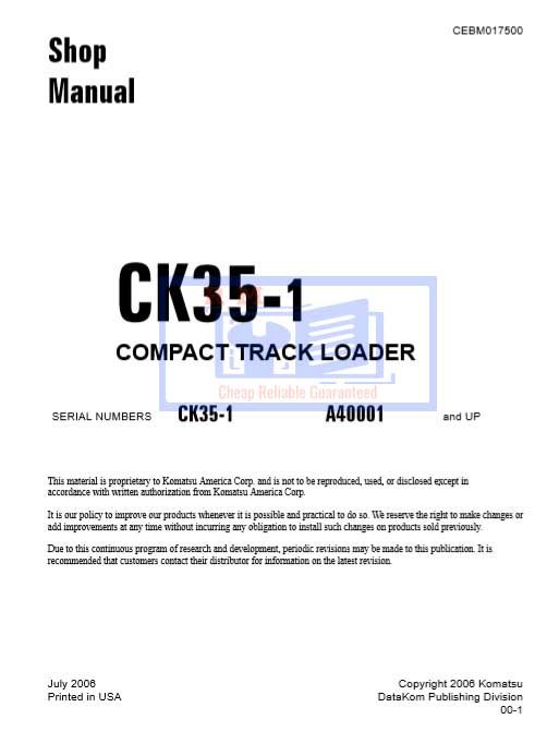 The Komatsu CK35-1 Compact Track Loader Workshop Manual is an essential resource for maintaining and repairing your equipment with precision. This comprehensive guide provides detailed instructions, diagrams, and specifications, ensuring that you can troubleshoot and resolve issues efficiently. With its user-friendly layout, this manual empowers operators and technicians alike to enhance the performance and longevity of the CK35-1, making it a valuable addition to your maintenance toolkit. Invest in this workshop manual to ensure your machinery operates at its best, minimizing downtime and maximizing productivity