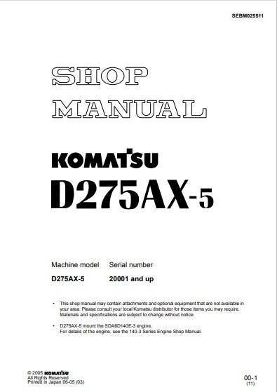 The Komatsu D275AX-5 Japan Bulldozer Workshop Manual is an essential resource for professionals and enthusiasts alike, providing comprehensive guidance on maintenance, repair, and operation of this powerful machine. With detailed diagrams, step-by-step instructions, and troubleshooting tips, this manual ensures that you can keep your bulldozer running smoothly and efficiently. Invest in this workshop manual to enhance your understanding and extend the lifespan of your equipment, making it a valuable addition to your technical library