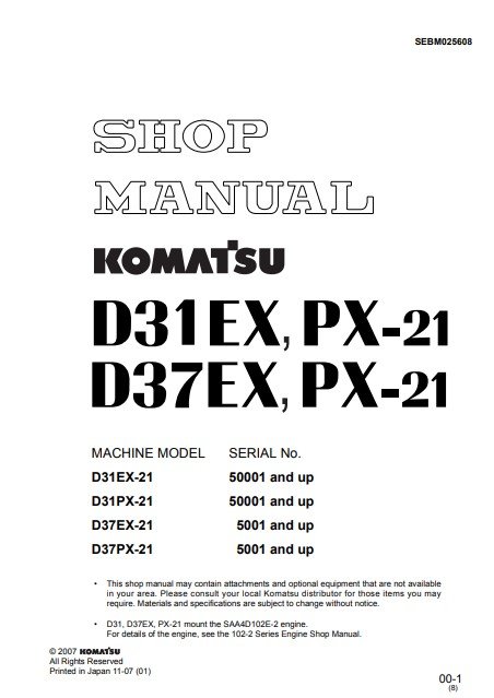 Enhance your maintenance capabilities with the Komatsu D31EX-21, D31PX-21, D37EX-21, and D37PX-21 Bulldozer Workshop Manual. This comprehensive guide provides detailed instructions, diagrams, and troubleshooting tips specifically designed for these powerful bulldozer models. With clear illustrations and step-by-step procedures, you can ensure optimal performance and longevity of your equipment, making it an essential resource for both professionals and DIY enthusiasts. Invest in this workshop manual to streamline your repair processes and keep your bulldozer running smoothly