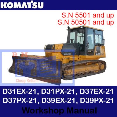 Workshop manual cover for Komatsu D31 and D37 series bulldozers, detailing models D31EX-21, D31PX-21, D37EX-21, D37PX-21Komatsu D31EX-21, D31PX-21, D37EX-21, D37PX-21, D39EX-21, D39PX-21 Bulldozer Workshop Manual