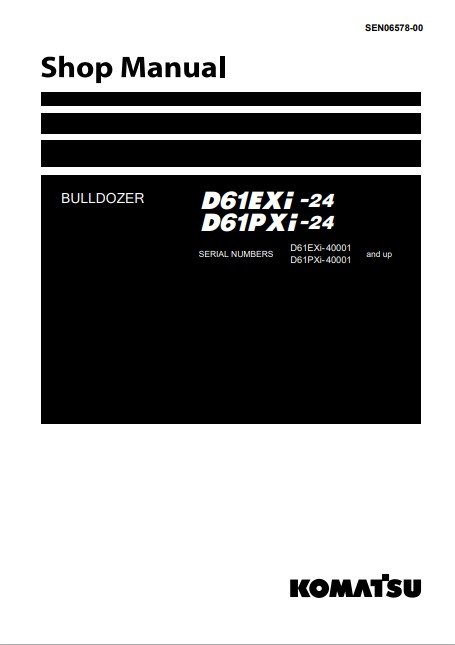 Enhance your maintenance capabilities with the Komatsu D61EXi-24 and D61PXi-24 Workshop Manual. This comprehensive guide provides detailed instructions and diagrams, ensuring you have all the necessary information to keep your bulldozer operating at peak performance. With step-by-step procedures and troubleshooting tips, this manual is an essential resource for both professionals and DIY enthusiasts, allowing for efficient repairs and maintenance that can save time and reduce costs. Invest in your machinery’s longevity and reliability with this indispensable workshop manual