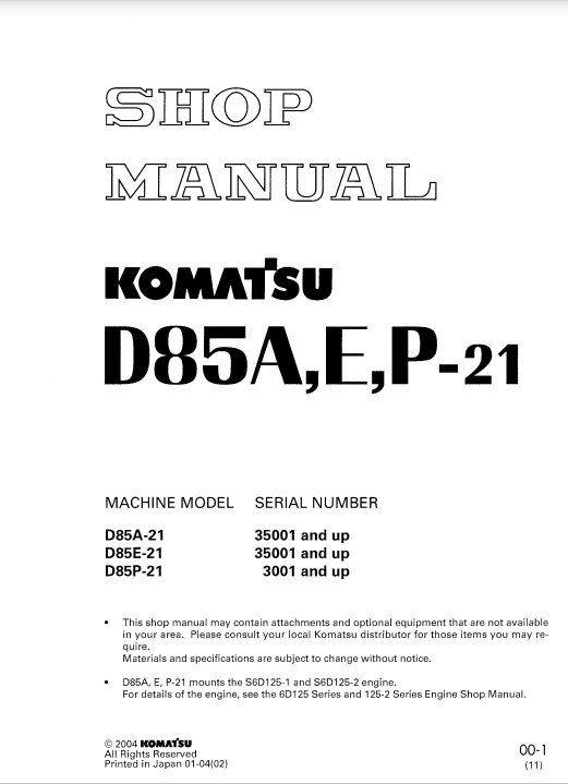 The Komatsu D85A-21, D85E-21, and D85P-21 Bulldozer Workshop Manual is an essential resource for operators and technicians seeking to maintain and repair these powerful machines. This comprehensive manual provides detailed instructions, diagrams, and specifications, ensuring that you can perform maintenance tasks efficiently and effectively. With clear guidance on troubleshooting and repairs, this workshop manual empowers you to keep your bulldozer in optimal working condition, enhancing productivity and extending the lifespan of your equipment. Invest in this manual to ensure your machinery operates at peak performance
