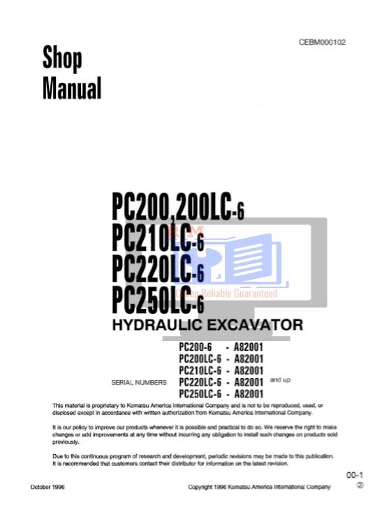Ensure top performance and long-lasting durability of your Komatsu PC200-6,PC200LC-6,PC210LC-6,PC220LC-6,PC250LC-6 Excavators with this comprehensive Workshop Repair Manual. Designed specifically for professional technicians, mechanics, and equipment owners, this manual provides detailed instructions, diagrams, and specifications to perform maintenance, service, diagnostics, and repairs with confidence