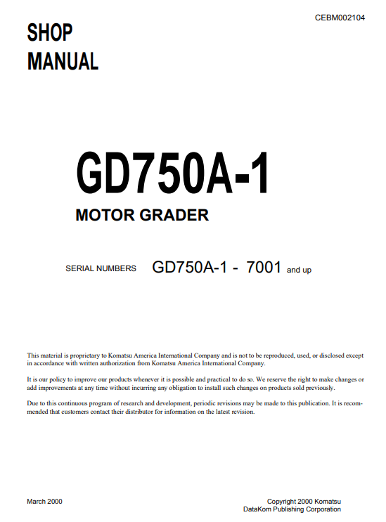 Komatsu GD750A-1 Motor Grader Workshop Repair Manual