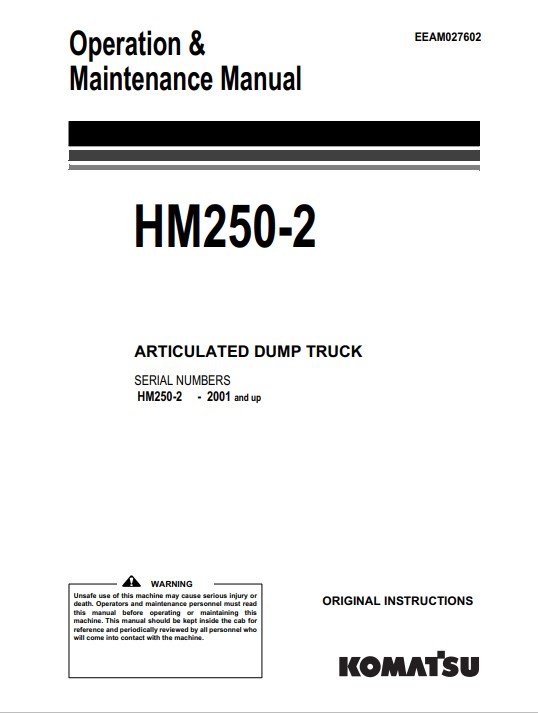 Enhance the performance and longevity of your Komatsu HM250-2 Dump Truck with the comprehensive Operation and Maintenance Manual. This essential guide provides detailed instructions on operation, maintenance schedules, and troubleshooting tips, ensuring your equipment runs smoothly and efficiently. With clear diagrams and expert insights, this manual is an invaluable resource for operators and maintenance personnel alike, helping to minimize downtime and maximize productivity on the job site. Invest in your equipment’s reliability and efficiency