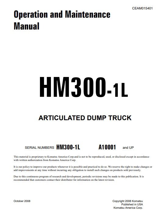 Enhance the longevity and performance of your Komatsu HM300-1 Dump Truck with the comprehensive Operation and Maintenance Manual. This essential guide provides detailed instructions on operation, maintenance schedules, and troubleshooting tips, ensuring your equipment runs smoothly and efficiently. With clear diagrams and expert insights, this manual is an invaluable resource for operators and maintenance personnel alike, helping to minimize downtime and maximize productivity on the job site. Invest in your equipment’s reliability and performance