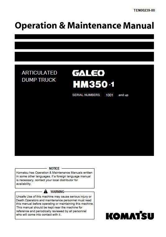 Enhance the longevity and performance of your Komatsu HM350-1 Dump Truck with the comprehensive Operation and Maintenance Manual. This essential guide provides detailed instructions on operation, maintenance schedules, and troubleshooting tips, ensuring your equipment runs smoothly and efficiently. With clear diagrams and expert insights, this manual is an invaluable resource for operators and maintenance personnel alike, helping to minimize downtime and maximize productivity on the job site. Invest in your equipment’s reliability and performance