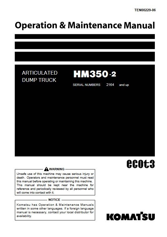 Enhance the performance and longevity of your Komatsu HM350-2 Dump Truck with the comprehensive Operation and Maintenance Manual. This essential guide provides detailed instructions on operation, maintenance schedules, and troubleshooting tips, ensuring your equipment runs smoothly and efficiently. With clear diagrams and expert insights, you can maximize productivity and minimize downtime, making it an indispensable resource for operators and maintenance personnel alike. Invest in this manual to safeguard your investment and keep your dump truck in peak condition