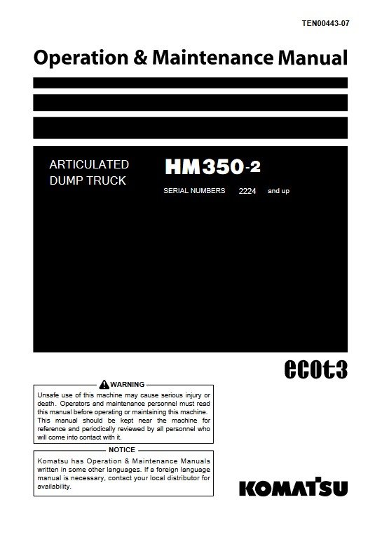 Enhance the performance and longevity of your Komatsu HM350-2 Dump Truck with the comprehensive Operation and Maintenance Manual. This essential guide provides detailed instructions on operation, maintenance schedules, and troubleshooting tips, ensuring your equipment runs smoothly and efficiently. With clear diagrams and expert insights, this manual is an invaluable resource for operators and maintenance personnel alike, helping to minimize downtime and maximize productivity on the job site. Invest in your equipment’s reliability and efficiency