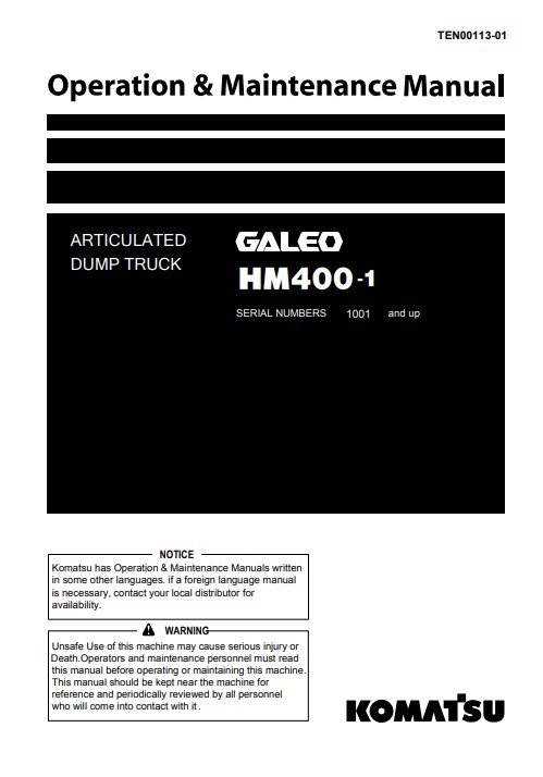 Enhance the longevity and performance of your Komatsu HM400-1 Dump Truck with the comprehensive Operation and Maintenance Manual. This essential guide provides detailed instructions on operation, maintenance schedules, and troubleshooting tips, ensuring your equipment runs smoothly and efficiently. With clear diagrams and expert insights, this manual is an invaluable resource for operators and maintenance personnel alike, helping to minimize downtime and maximize productivity on the job site. Invest in your equipment’s reliability and performance