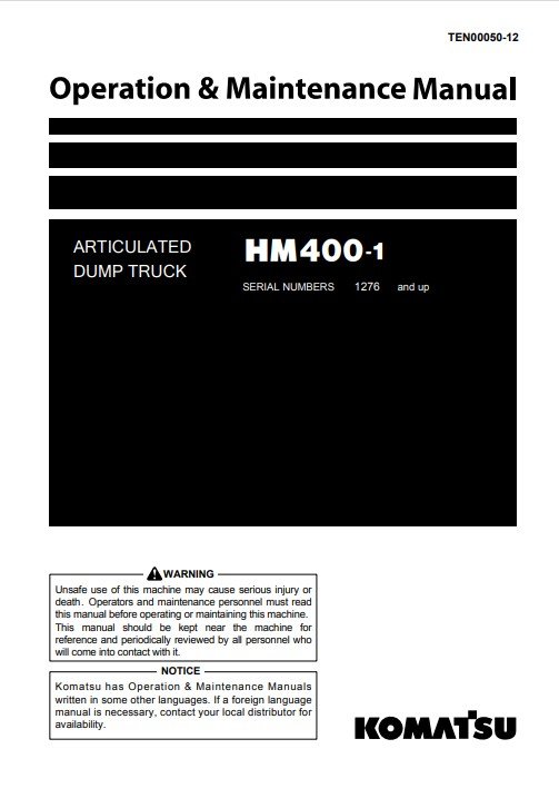 Enhance the longevity and performance of your Komatsu HM400-1 Dump Truck with the comprehensive Operation and Maintenance Manual. This essential guide provides detailed instructions on operation, maintenance schedules, and troubleshooting tips, ensuring your equipment runs smoothly and efficiently. With clear diagrams and expert insights, this manual is an invaluable resource for operators and maintenance personnel alike, helping to minimize downtime and maximize productivity on the job site. Invest in your equipment’s reliability and performance