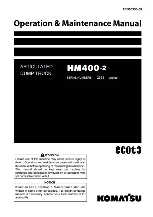 Enhance the longevity and performance of your Komatsu HM400-2 Dump Truck with the comprehensive Operation and Maintenance Manual. This essential guide provides detailed instructions on operation, maintenance schedules, and troubleshooting tips, ensuring your equipment runs smoothly and efficiently. With clear diagrams and expert insights, this manual is an invaluable resource for operators and maintenance personnel alike, helping to minimize downtime and maximize productivity on the job site. Invest in your equipment’s reliability and performance