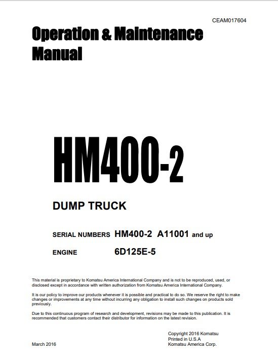 Komatsu HM400-2 USA Dump Truck S.N A11001-U Operation and Maintenance Manual