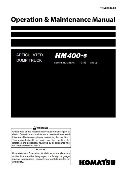 Enhance the longevity and performance of your Komatsu HM400-5 Dump Truck with the comprehensive Operation and Maintenance Manual. This essential guide provides detailed instructions on operation, maintenance schedules, and troubleshooting tips, ensuring your equipment runs smoothly and efficiently. With clear diagrams and expert insights, this manual is an invaluable resource for operators and maintenance personnel alike, helping to minimize downtime and maximize productivity on the job site. Invest in your equipment’s reliability and performance
