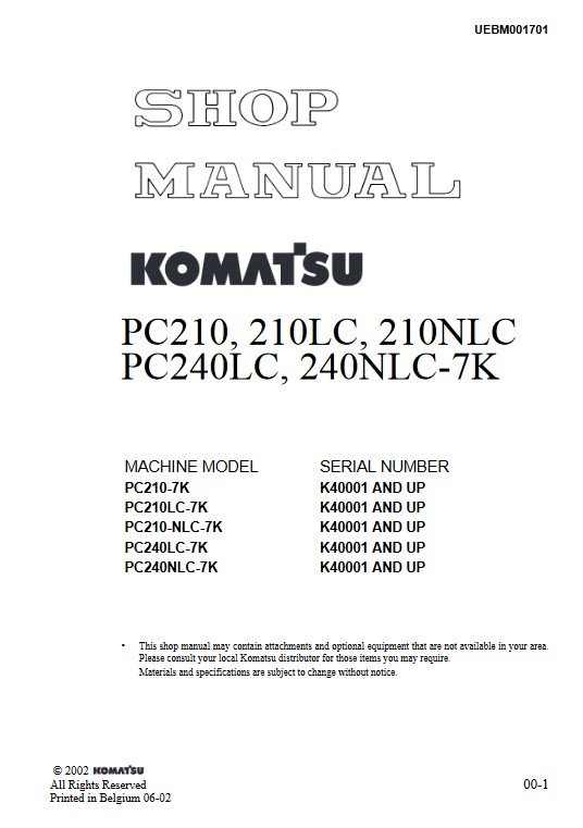 Enhance your maintenance capabilities with the Komatsu PC210-7K and PC240-7K Workshop Repair Manual. This comprehensive guide provides detailed instructions, diagrams, and troubleshooting tips specifically designed for these powerful excavators. With easy-to-follow steps, you can ensure optimal performance and longevity of your machinery, saving time and reducing repair costs. Invest in this essential manual to keep your equipment running smoothly and efficiently