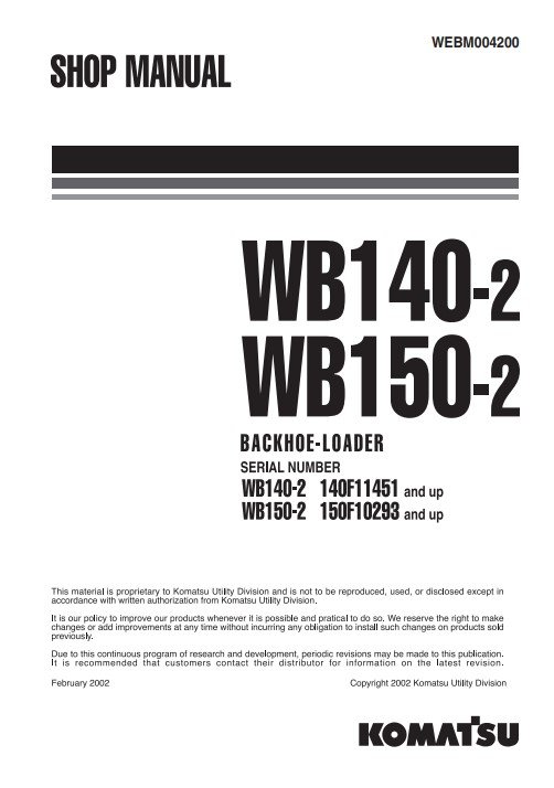 Enhance your maintenance capabilities with the Komatsu WB140-2 and WB150-2 Italy Backhoe Loader Workshop Manual. This comprehensive guide provides detailed instructions, diagrams, and specifications essential for efficient servicing and repair of your backhoe loader. With clear, step-by-step procedures, you can ensure optimal performance and longevity of your equipment, saving time and reducing downtime. Invest in this workshop manual to empower your technical skills and keep your machinery running smoothly