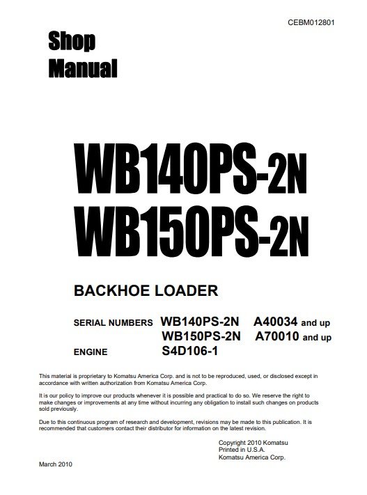 Enhance your maintenance capabilities with the Komatsu WB140PS-2N and WB150PS-2N USA Backhoe Loader Workshop Manual. This comprehensive guide provides detailed instructions, diagrams, and troubleshooting tips specifically designed for these models, ensuring you can perform repairs and maintenance with confidence. With this manual, you’ll save time and money by tackling issues efficiently, keeping your backhoe loader in optimal working condition for all your projects. Invest in this essential resource to maximize the performance and longevity of your equipment